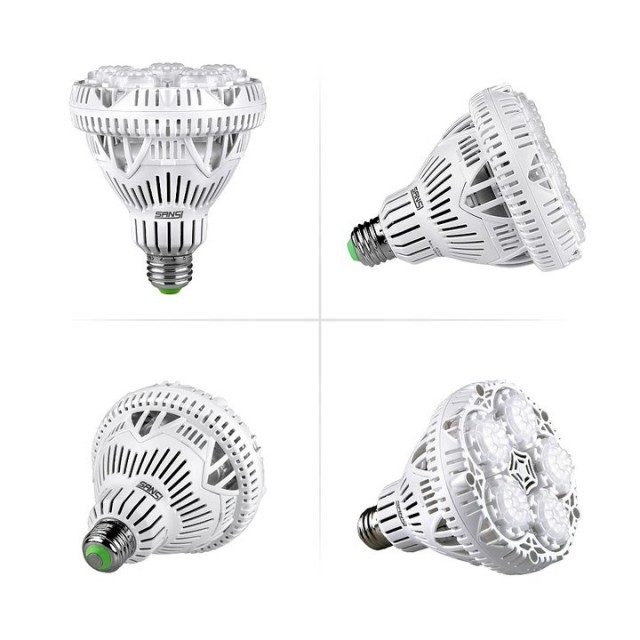 SANSI Daylight Full Spectrum LED-plantebelysning - fullspektret LED-spotlights. De har en patentert LED-teknologi for keramisk varmespredning, jevn belysning og et jevnt lysspektrum. Sammenlignet med andre plantelamper (alle konkurrenter bruker LED-lys i aluminium), spres keramikk varmen mer effektivt enn aluminium fordi den ikke er ledende. Dette betyr at det oppstår mindre varme og dermed gir mer energibesparelser.