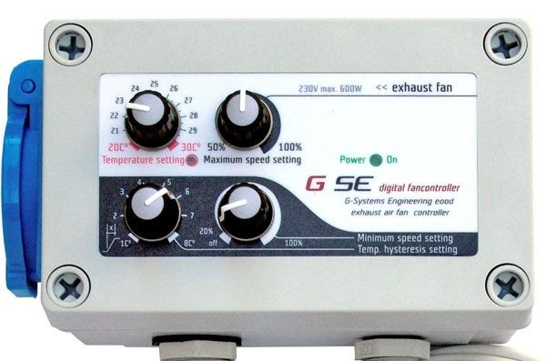 The Temperature, minimum-, maximum- speed controller with hysteresis setting is a temperature depended speed controller for ventilated rooms with one ore more fans. The controller keeps the temperature constantly and impedes to run under the set minimum-speed, as well to run over the set maximum speed. The hysteresis defines the temperature range. It can be easily controlled, adjusting the required temperature minimum-, maximum speed and hysteresis on four knobs.