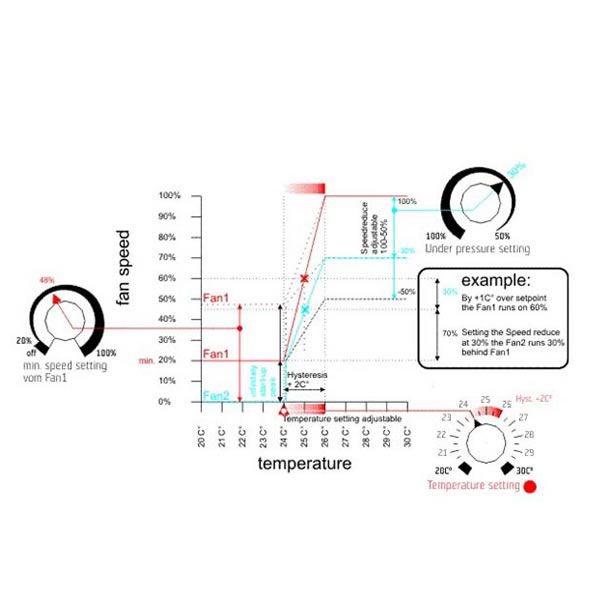 The digital fan controller is a temperature dependent speed controller for rooms with air flow in and out. The fan controller keeps the room temperature constant and under pressure to prevent odour from escaping. It can be easily controlled, adjusting the required temperature, minimum speed and the pressure of your room on four knobs. This fan controller can by used also as only air out regulator on two fans if there is a nature way of air in.